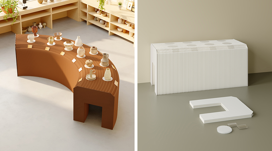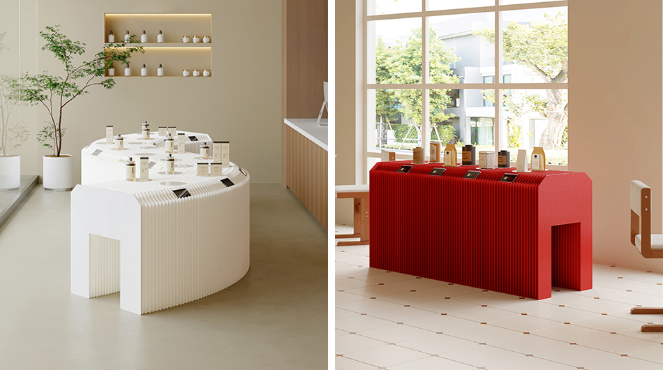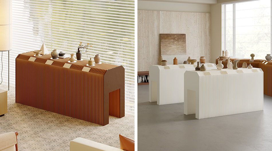 对称性线条,创造干净的视觉效果。源于博物馆灵感,为展台增加展签区域。平稳置物的同时,侧边可置展签介绍,让展示更有亮点,满足现代多元陈列